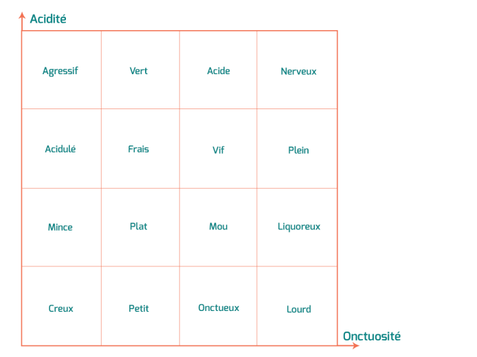 Vous chercherez à caractériser l'axe dominant. Vous pourrez ainsi placer le vin sur le tableau suivant: