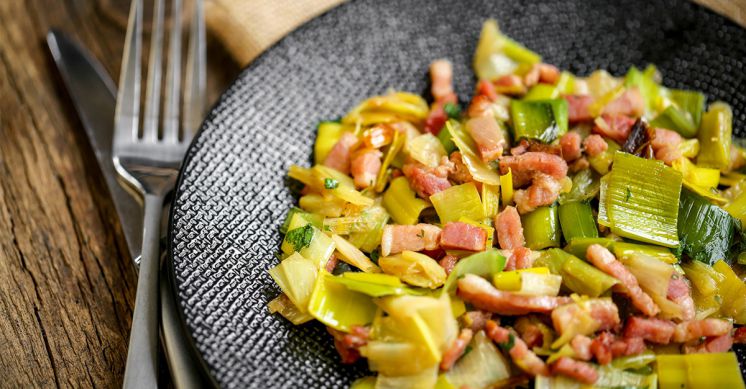 Dans une poêle, faites rissoler les lardons. Une fois dorés, mettez-les de côté et ajoutez à la place, le poireau et le beurre.