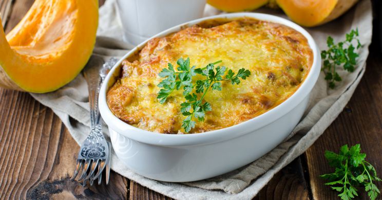Disposez les morceaux de courge et de poitrine dans un plat à gratin, en mélangeant délicatement.