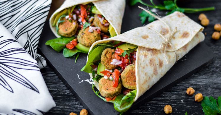 Après avoir réchauffé quelques minutes vos tortillas au four, déposez-les dans votre assiette. Ajoutez ensuite à votre convenance: de la salade, des tomates, des carottes râpée, de l’avocat et des oignons rouges. Terminez avec 4 falafels.