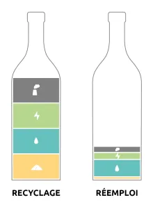 Dans le cas d’une bouteille en verre, l’étape de fabrication de l’emballage est la plus impactante d’un point de vue environnemental. Ainsi, plus la bouteille est réemployée, plus les impacts liés à sa fabrication sont faibles. En 2009, une étude française, menée par Deroche Consultants pour le compte des Brasseurs d’Alsace et des Embouteilleurs de verre consigné, conclue que le réemploi des bouteilles en verre permet de réduire la consommation d’énergie primaire de 76%, d’émettre 79% d’émissions de gaz à effet de serre en moins et d’économiser 33% d’eau par rapport au recyclage.